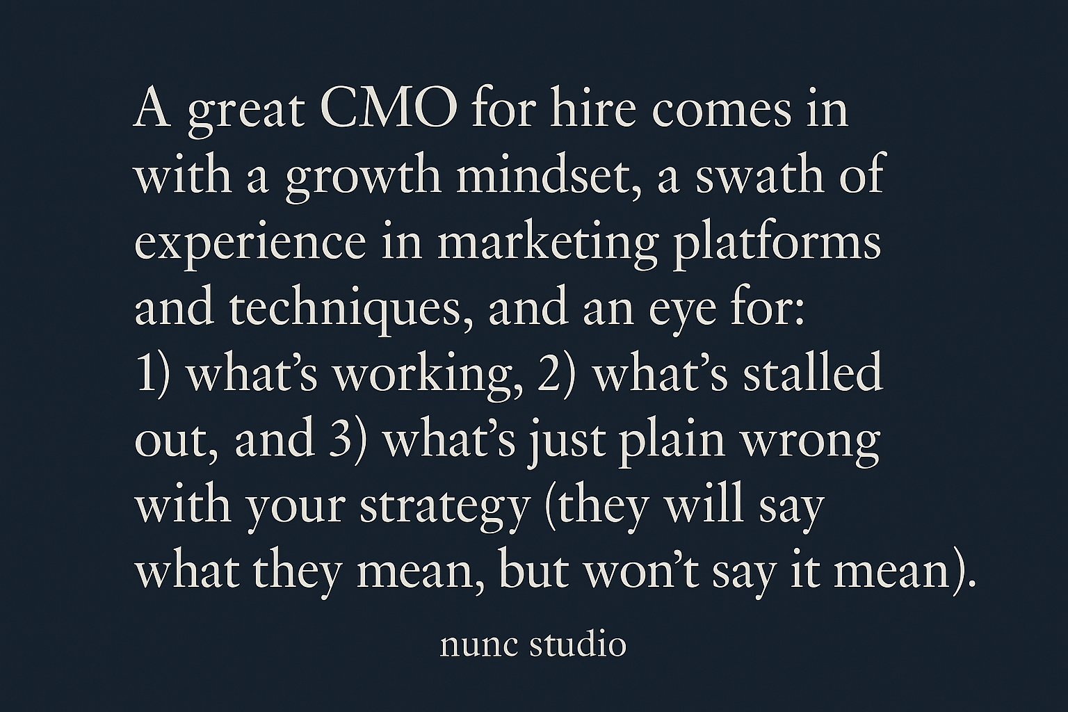 Whew. Lots of info there for you to mull over. If you’d like to discuss potentially working with me (Kit, hi, I’m Nunc Studio’s founder), drop me a line. And if you need a fractional CMO’s brain ASAP, you can also book an hour of my time to ask me any and all questions you have. It’s also a great way to get a sense of how we’d work together.