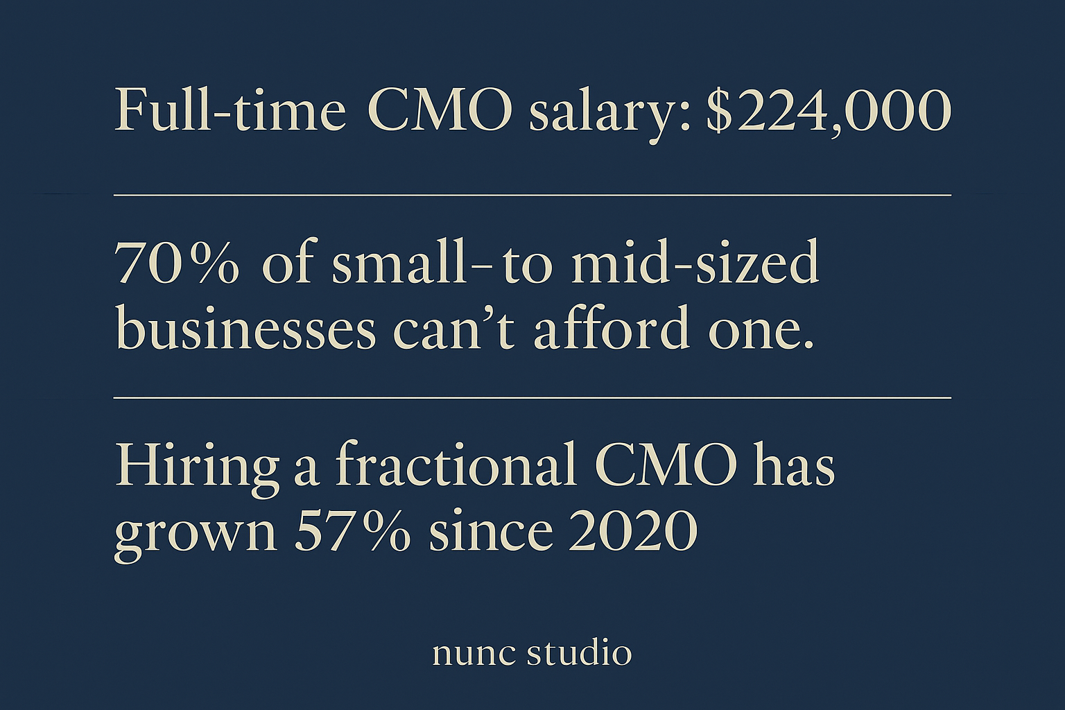 - 70% of small-to-mid-sized businesses in the U.S. report that they can’t afford to hire a full-time CMO.